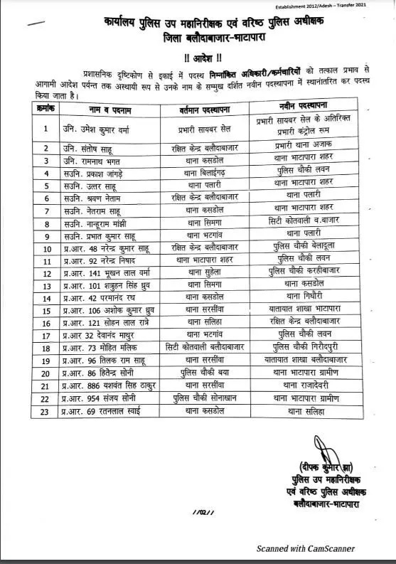 बलौदाबाजार। एसपी दीपक झा ने पुलिस विभाग में बड़ा फेरबदल किया है. 3 उपनिरीक्षक, 6 सहायक उपनिरीक्षक सहित 14 प्रधान आरक्षकों समेत 23 पुलिसकर्मियों का तबादला किया है. SP दीपक झा के पदभार के बाद पहली स्थानांतरण की लिस्ट जारी हुई है. बहुत जल्द थानेदारों और आरक्षकों के भी स्थानांतरण के संकेत मिल रहे हैं. पुलिस कसावट लाने के लिए फेरबदल किया गया है.
