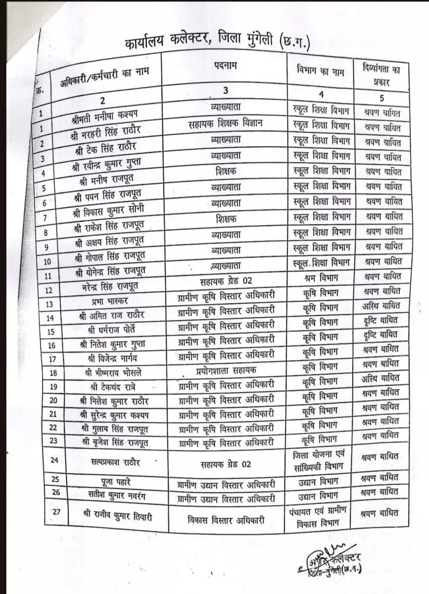 मुंगेली : छत्तीसगढ़ के मुंगेली जिले में फर्जी श्रवण बाधित प्रमाण पत्र के आधार पर सरकारी नौकरी कर रहे 27 कर्मचारियों को बर्खास्त कर दिया गया है। ये कर्मचारी सालों से सरकार को धोखा देकर अलग-अलग विभागों में कार्यरत थे। शिकायत मिलने के बाद जांच कराई गई, जिसमें प्रमाण पत्रों में भारी गड़बड़ी पाई गई। इसके बाद प्रशासन ने कार्रवाई करते हुए सभी को सेवा से हटा दिया।