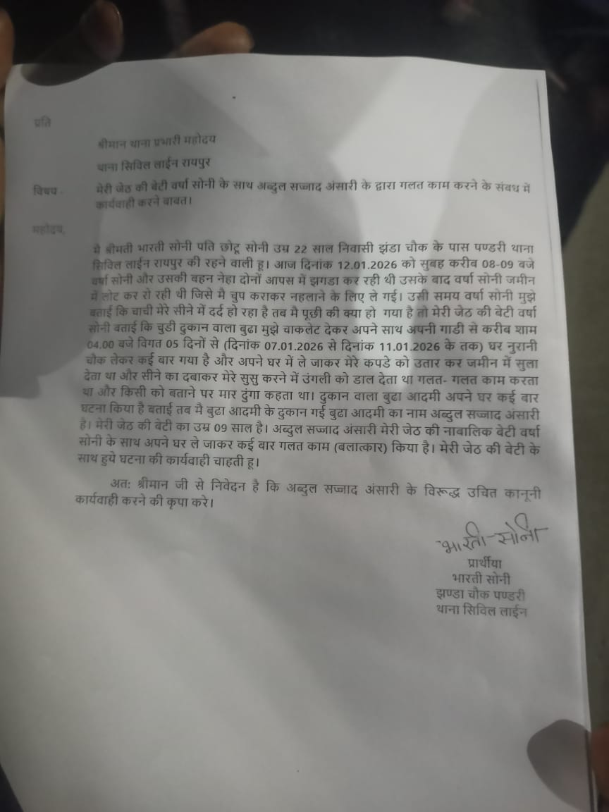 रायपुर। Minor Girl Rape In Raipur : राजधानी रायपुर से इस वक्त एक बड़ी खबर सामने आ रही है। जहां एक मुस्लिम समाज के 55 वर्षीय बुजुर्ग ने 9 वर्ष की नाबालिग बच्ची से दुष्कर्म की घिनौनी वारदात को अंजाम दिया है। घटना के आसपास के लोगों में और बजरंग दल के कार्यकर्ताओं में आक्रोश का माहौल है। जिसकी शिकायत लेकर सभी थाने पहुंचे।