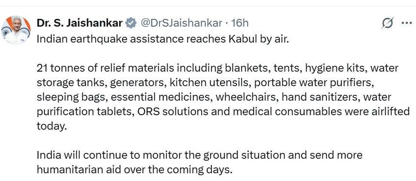 भारत ने भी अफगानिस्तान की मदद के लिए बड़ा कदम उठाया है। भारतीय विदेश मंत्री एस. जयशंकर ने ‘एक्स’ पर जानकारी दी कि भारत ने 21 टन मानवीय सहायता मंगलवार को भेजी है। इसमें कंबल, टेंट, स्वच्छता किट, जनरेटर, दवाइयाँ और चिकित्सा उपकरण शामिल हैं। भारत पहले भी तालिबान-शासित अफगानिस्तान को कई मौकों पर सहायता भेज चुका है और इस बार भी उसने यह कदम पूरी तरह मानवता के आधार पर उठाया।