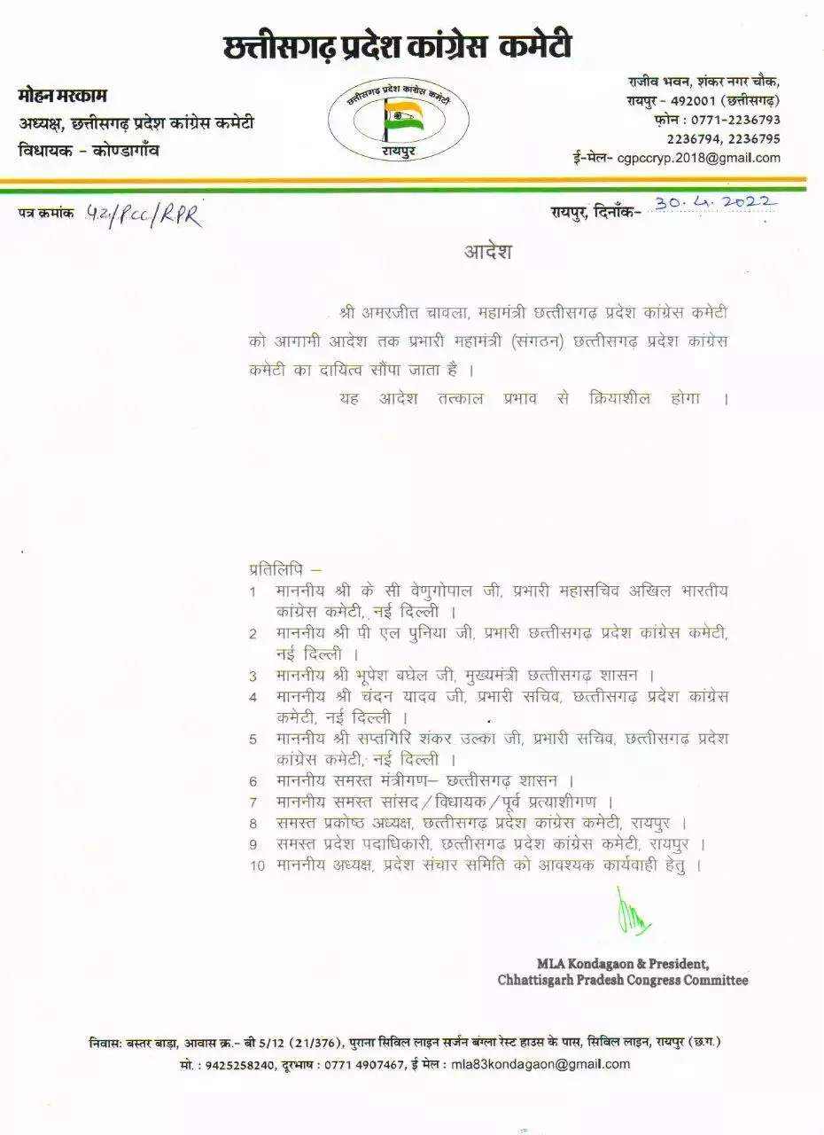 BREAKING : अमरजीत चावला को मिली प्रभारी महामंत्री संगठन की भी जिम्मेदारी, पीसीसी चीफ ने जारी किया आदेश