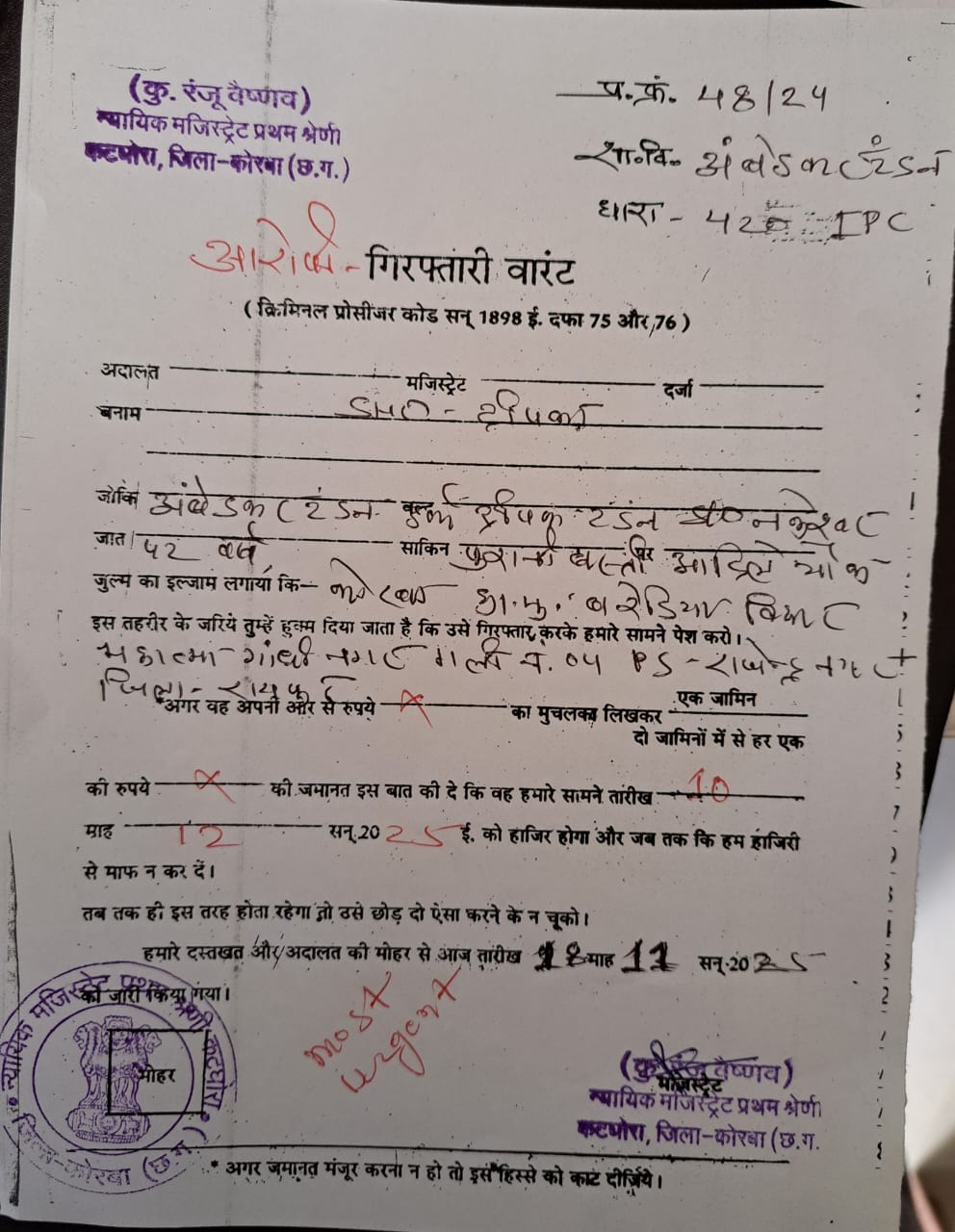 वहीं दीपका थाने में दीपक टंडन के खिलाफ धोखाधड़ी के मामला दर्ज होने के बाद कोर्ट में केस चल रहा था। जिसमें बताया गया कि, टंडन को 12 दिसंबर 2025 को पेश होना था, लेकिन अनुपस्थिति पर न्यायिक मजिस्ट्रेट प्रथम श्रेणी कटघोरा ने वारंट जारी किया। वहीं कोर्ट के आदेश के बाद से ही दीपका पुलिस आरोपी दीपक टंडन की तलाश कर रही है।