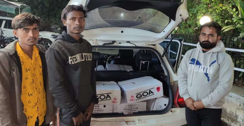 इसी तरह थाना विधानसभा क्षेत्र के ग्राम दोंदेखुर्द मुख्य मार्ग पास स्विफ्ट कार क्रमांक सी जी/25/जे/4944 को चिन्हांकित कर पकड़ा गया। वाहन के अंदर तीन व्यक्ति व्यक्ति सवार थे, जिनसे टीम के सदस्यों द्वारा पूछताछ करने पर व्यक्तियों ने अपना नाम सुनील पटेल, रोशन पटेल एवं डोमन निषाद निवासी बेरला का होना बताया। टीम के सदस्यों द्वारा उनके वाहन की तलाशी लेने पर वाहन के अंदर शराब रखा होना पाया गया। शराब परिवहन करने के संबध में व्यक्तियों से वैध दस्तावेज की मांग की गई, परंतु उक्त व्यक्तियों द्वारा शराब परिवहन करने के संबंध में किसी प्रकार का कोई भी वैध दस्तावेज या अन्य कागजात प्रस्तुत नहीं किया गया। जिस पर टीम द्वारा तीनों आरोपियों को गिरफ्तार कर उनके कब्जे से मध्य-प्रदेश राज्य निर्मित 14 पेटी गोवा ब्राॅण्ड की अंग्रेजी शराब एवं शराब तस्करी में प्रयुक्त स्विफ्ट कार क्रमांक सी जी/25/जे/4944 जुमला कीमती लगभग 5,91,000/- रूपये जप्त किया जाकर आरोपियों के विरूद्ध थाना विधानसभा में अपराध क्रमांक 463/21 धारा 34(2) आबकारी एक्ट का अपराध पंजीबद्ध कर तीनों आरोपियों के विरूद्ध अग्रिम कार्यवाही किया गया।