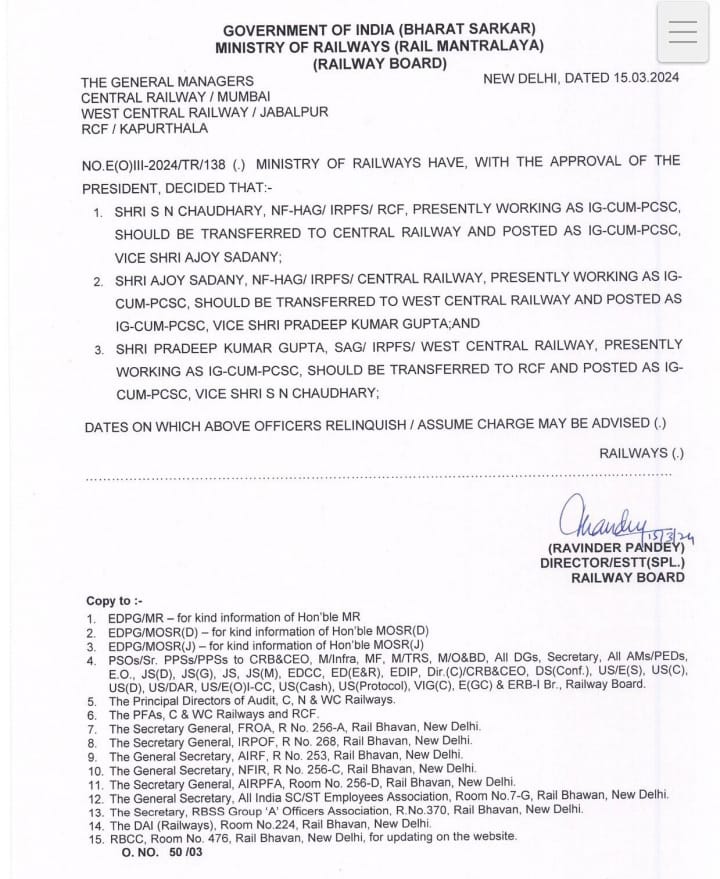ये आदेश रेलवे बोर्ड के डायरेक्टर रविंद्र पांडे के हस्ताक्षर से जारी हुआ है. इसमें श्री चौधरी को सेंट्रल रेलवे, श्री सदान्य को वेस्ट सेंट्रल रेलवे और श्री गुप्ता को आरसीएफ यानी रेलवे कोच फैक्ट्री में पदस्थ किया गया है.