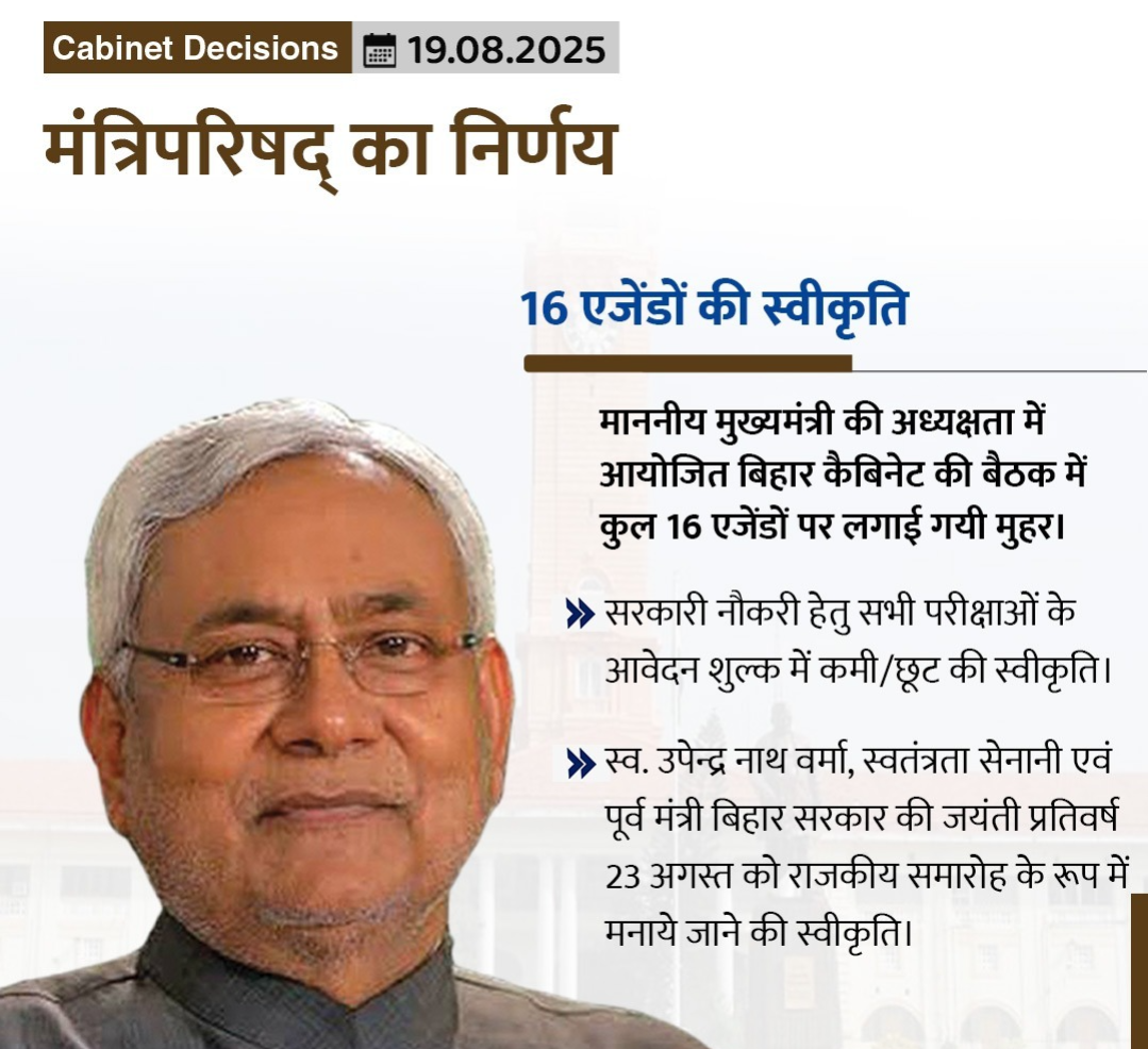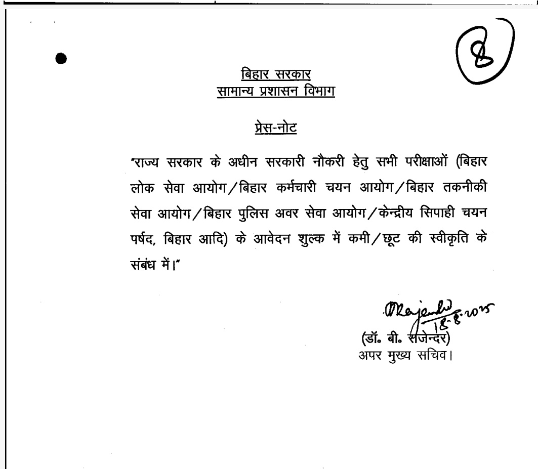 बिहार लोक सेवा आयोग, बिहार कर्मचारी चयन आयोग और अन्य सरकारी भर्ती निकायों द्वारा आयोजित सभी परीक्षाओं के लिए आवेदन शुल्क में कमी/छूट को भी मंजूरी दी गई है ।