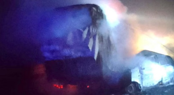 ट्रक से टक्कर के बाद आग का गोला बनी कार, तीन लोगों की मौत