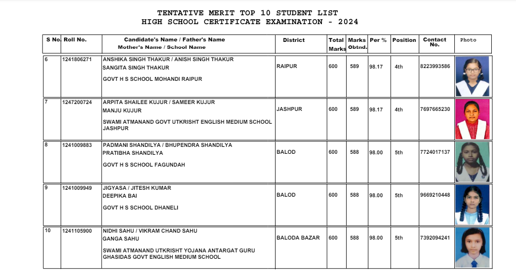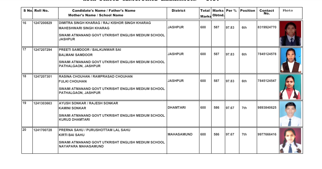 बता दे कि इस बार 12वीं में महासमुंद की महक अग्रवाल ने टॉप किया है वही बलोदा बाजार की कोपाल अंबेस्ट ने दूसरा रैंक हासिल किया है, 12 वीं में प्रीती और आयुषी ने तीसरा स्थान प्राप्त किया है, दसवीं की बात करें तो जशपुर की सिमरन शबा ने पहला स्थान हासिल किया है वह गरियाबंद की होनिशा ने दूसरा स्थान प्राप्त किया है व श्रेयांश कुमार यादव ने तीसरा स्थान दसवीं में प्राप्त किया है,