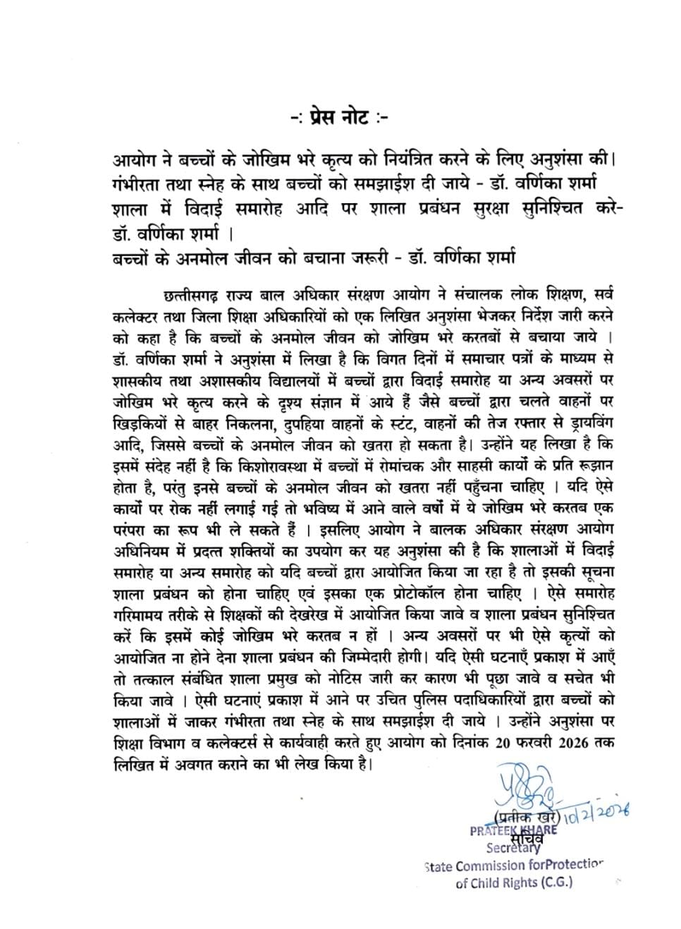 रायपुर। Raipur News: छत्तीसगढ़ राज्य बाल संरक्षण आयोग ने स्कूलों में आयोजित होने वाली फेयरवेल पार्टियों और अन्य कार्यक्रमों को लेकर सख्त रुख अपनाया है। आयोग ने लोक शिक्षण संचालनालय, प्रदेश के सभी कलेक्टरों और जिला शिक्षा अधिकारियों को आवश्यक निर्देश जारी करने को कहा है।