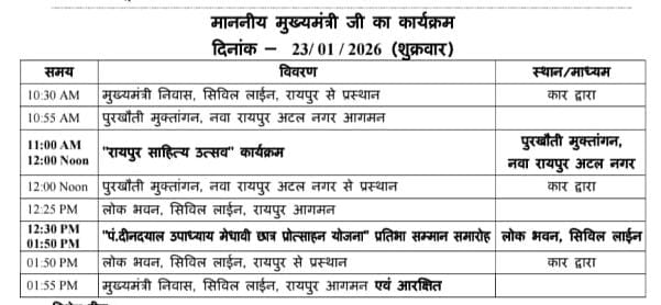 CM Sai Today Program: कार्यक्रम के बाद सीएम सिविल लाइन के लिए रवाना होंगे। यहां वे लोक भवन में आयोजित पंडित दीनदयाल उपाध्याय मेधावी छात्र प्रोत्साहन योजना के तहत छात्रों को सम्मानित करेंगे। इसके बाद दोपहर 2:00 बजे मुख्यमंत्री निवास के लिए रवाना होंगे।
