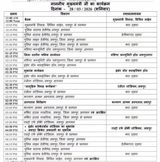 CM Sai Visit Jashpur: सीएम साय दोपहर करीब 3.50 बजे इंडोर बास्केटबॉल स्टेडियम और जशपुर क्रिकेट एकेडमी का शुभारंभ करेंगे और शाम 5.50 बजे राजधानी रायपुर वापस लौट आएंगे।