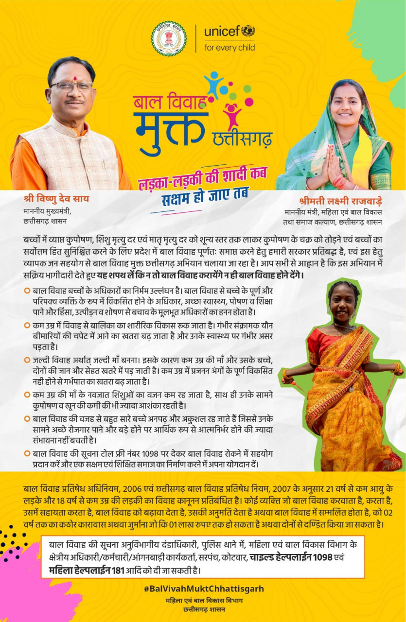 गौरतलब है कि राष्ट्रीय परिवार स्वास्थ्य सर्वेक्षण-5 की रिपोर्ट के अनुसार छत्तीसगढ़ में 12.1 प्रतिशत बालिकाओं का विवाह 18 वर्ष से कम आयु में हो जाता है। इसमें सूरजपुर जिले में सर्वाधिक 34.28 प्रतिशत, बलरामपुर में 24.60 प्रतिशत, कोरिया जिले में 22.89 प्रतिशत और जशपुर जिले में 21.90 प्रतिशत बाल विवाह होता है। बाल विवाह के इन आंकड़ों को ध्यान में रखते हुए बाल विवाह मुक्त छत्तीसगढ़ अभियान का शुभारंभ किया गया है।