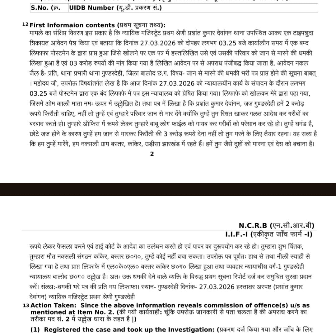 जानकारी के अनुसार, मजिस्ट्रेट प्रशांत कुमार देवांगन को एक बंद लिफाफे में धमकी भरा पत्र मिला, जिसमें 3 करोड़ रुपये की फिरौती की मांग की गई है। पत्र में पैसे नहीं देने पर मजिस्ट्रेट और उनके परिवार को जान से मारने की धमकी दी गई है। पत्र में खुद को नक्सली संगठन से जुड़ा बताया गया है और यह भी दावा किया गया है कि वे बस्तर, कांकेर, ओडिशा और झारखंड क्षेत्रों में सक्रिय हैं।