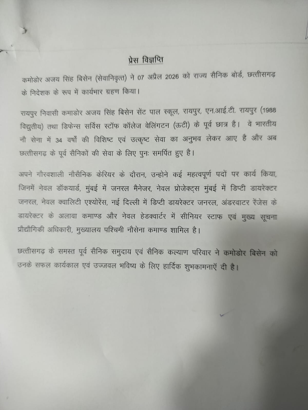 बता दें कि, अपने लंबे करियर में उन्होंने देश की सुरक्षा और नौसेना के आधुनिकीकरण में अहम योगदान दिया। छत्तीसगढ़ राज्य सैनिक बोर्ड के डायरेक्टर के रूप में अब वे पूर्व सैनिकों और उनके परिवारों के कल्याण से जुड़ी योजनाओं को आगे बढ़ाने में महत्वपूर्ण भूमिका निभाएंगे।
