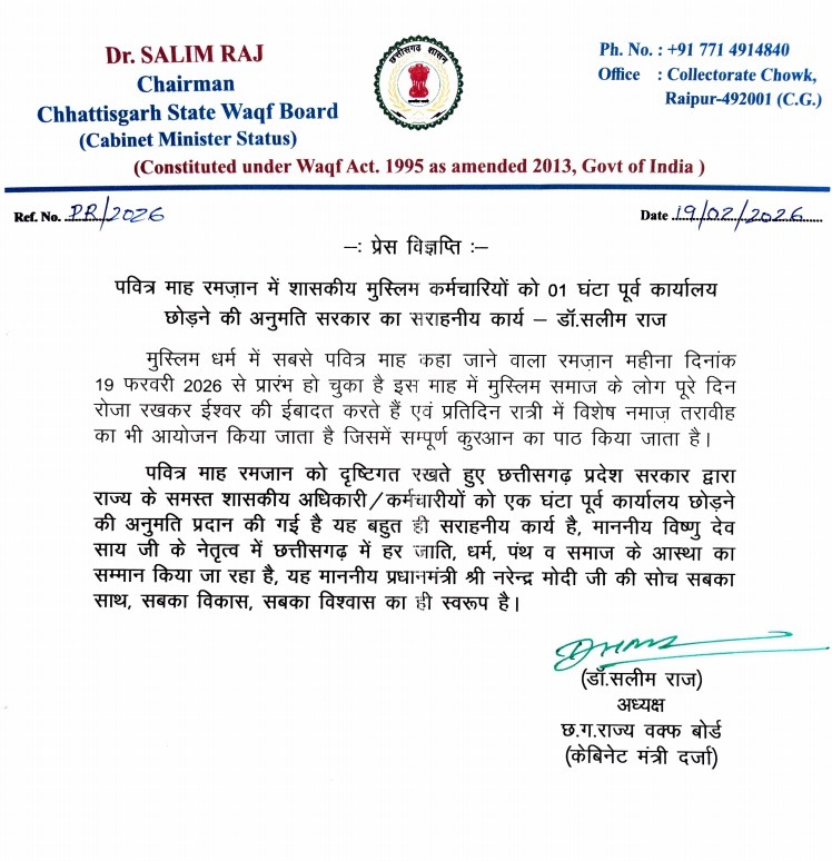 बता दें कि, छत्तीसगढ़ सरकार के इस फैसले का वक्फ बोर्ड के अध्यक्ष डॉ.सलीम राज ने इस फैसले का स्वागत किया। उन्होंने कहा कि, मुख्यमंत्री विष्णुदेव साय के नेतृत्व में भाजपा सरकार हर जाति, धर्म, पंथ व समाज की आस्था का सम्मान करती है। ये प्रधानमंत्री नरेंद्र मोदी के सबका साथ, सबका विकास, सबका विश्वास की सोच को दर्शाता है।