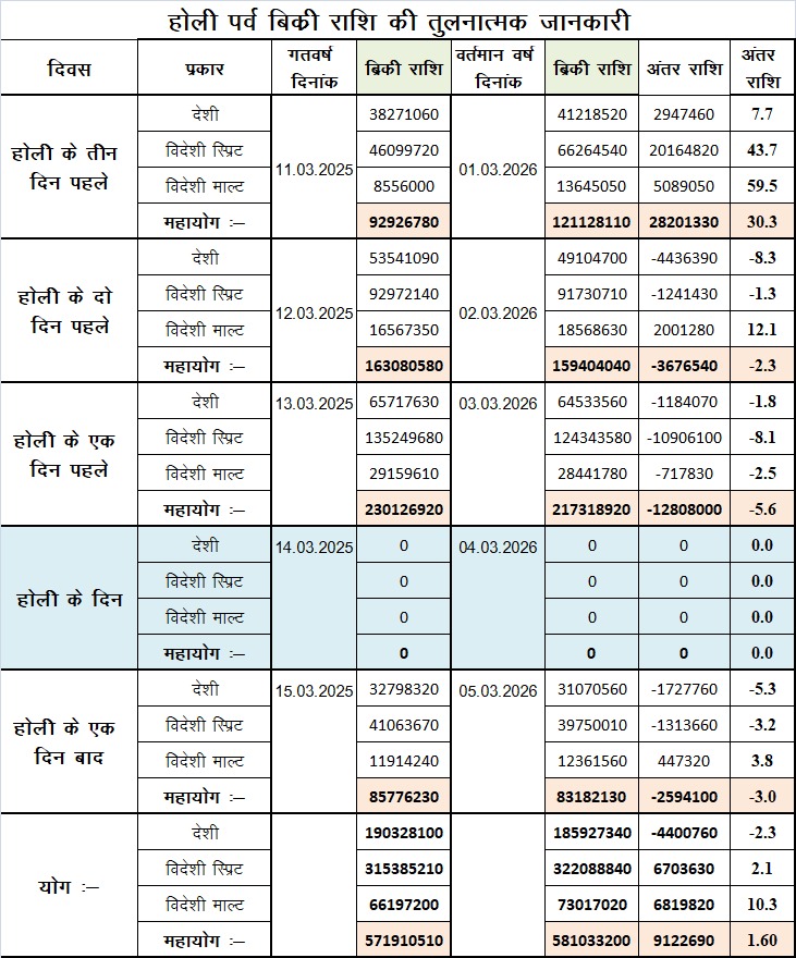 वहीं राजधानी रायपुर में होली के दौरान 4 दिनों में लगभग 58 करोड़ 10 लाख रुपए की शराब की बिक्री दर्ज की गई। बता दें कि सामान्य दिनों में छत्तीसगढ़ में औसतन करीब 40 करोड़ रुपये प्रतिदिन शराब की बिक्री होती है, लेकिन त्योहारों के समय यह आंकड़ा काफी बढ़ जाता है।