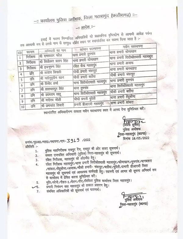 महासमुंद। पुलिस विभाग में एक बड़ा फेरबदल हुआ है। इस संबंध में महासमुंद एसपी विवेक शुक्ला ने 3 निरीक्षक और 7 उपनिरीक्षकों का तबादला आदेश जारी किया है। एसपी द्वारा जारी आदेश के मुताबिक तुमगांव थाना प्रभारी रामावतार पटेल को कोमाखान, सिद्धेश्वर प्रताप को थाना प्रभारी सिटी कोतवाली महासमुंद की जिम्मेदारी दी गई है। इसके अलावा 10 थाने के प्रभारियों का तबादला किया गया है।