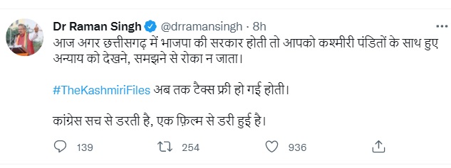 वहीं बीजेपी राष्ट्रीय उपाध्यक्ष व छत्तीसगढ़ के पूर्व मुख्यमंत्री डॉ रमन सिंह ने ट्विटर पर ट्वीट कर कांग्रेस पर निशाना साधा है. उन्होंने लिखा है, आज अगर छत्तीसगढ़ में भाजपा की सरकार होती तो आपको कश्मीरी पंडितों के साथ हुए अन्याय को देखने, समझने से रोका न जाता. TheKashmiriFiles अब तक टैक्स फ्री हो गई होती.कांग्रेस सच से डरती है, एक फ़िल्म से डरी हुई है.