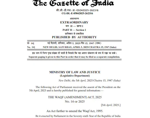 दिल्लीः राष्ट्रपति द्रौपदी मुर्मू ने वक्फ (संशोधन) बिल को मंजूरी दे दी है। इसके बाद सरकार ने नए कानून को लेकर गजट नोटिफिकेशन भी जारी कर दिया है। अब नए कानून को लागू करने की तारीख को लेकर केंद्र सरकार अलग से एक नोटिफिकेशन जारी करेगी। यह बिल (अब कानून) पर 2 अप्रैल को लोकसभा और 3 अप्रैल को राज्यसभा में 12-12 घंटे की चर्चा के बाद पास हुआ था।