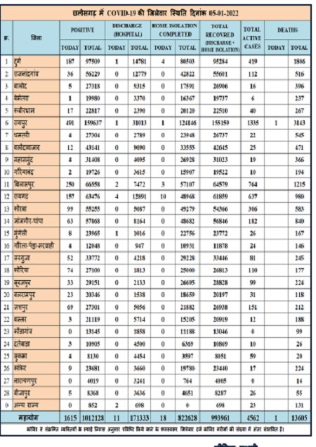 रायपुर। छत्तीसगढ़ में कोरोना का ग्राफ तेजी से बढ़ रहा है। धीरे-धीरे स्तिथि भयावह होते जा रही है. आज प्रदेश में कोरोना के 37 हज़ार 393 सैम्पलों की जांच हुई. जिसमें से प्रदेश भर में कुल 1632 लोग कोरोना पॉजिटिव मिले हैं. नए मरीज को मिलकर अब राज्य में कुल 4562 कोरोना के एक्टिव मरीजों की संख्या पहुँच गई है. वहीं रिकवरी रेट देखा जाए तो काफी कम है, जहां आज केवल 29 कोरोना मरीज स्वस्थ होकर घर वापस लौटे हैं. इसके साथ ही एक कोरोना संक्रमित मरीज की मृत्यु हुई है. मृत मरीज रायपुर जिले का है। रायपुर जिला हॉट स्पॉट बना हुआ है. आज जिले में 491 पॉजिटिव मरीज मिले हैं.