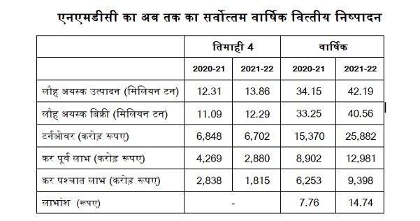 देश के सबसे बड़े लौह अयस्क उत्‍पादक ने 42 मिलियन टन उत्‍पादन टन के मील के पत्‍थर को पार करते हुए अब तक के सर्वोत्‍तम वित्‍तीय परिणाम दर्ज किए। वित्‍त वर्ष 2022 में इसने रूपए 25882 करोड़ का टर्नओवर रिकार्ड किया जो कि पिछले वर्ष के रूपए 15370 करोड़ पर 68% की वृद्धि है। एनएमडीसी ने वित्‍त वर्ष 2021-22 के दौरान रूपए 12981 करोड़ के कर पूर्व लाभ की घोषणा की जो वित्‍त वर्ष 2020-21 के रूपए 8,902 करोड़ पर 46% की वृद्धि दर्शाता है। इसी प्रकार वर्ष के दौरान कर पश्‍चात लाभ रूपए 9,398 करोड़ रहा जो पिछले वित्‍त वर्ष के रूपए 6,253 करोड की उपलब्धि पर 50% की बड़ी वृद्धि दर्शाता है। सार्वजनिक क्षेत्र की कंपनी ने वित्‍त वर्ष 2022 के दौरान अब तक का सर्वाधिक लाभांश 1474% का भी भुगतान किया।