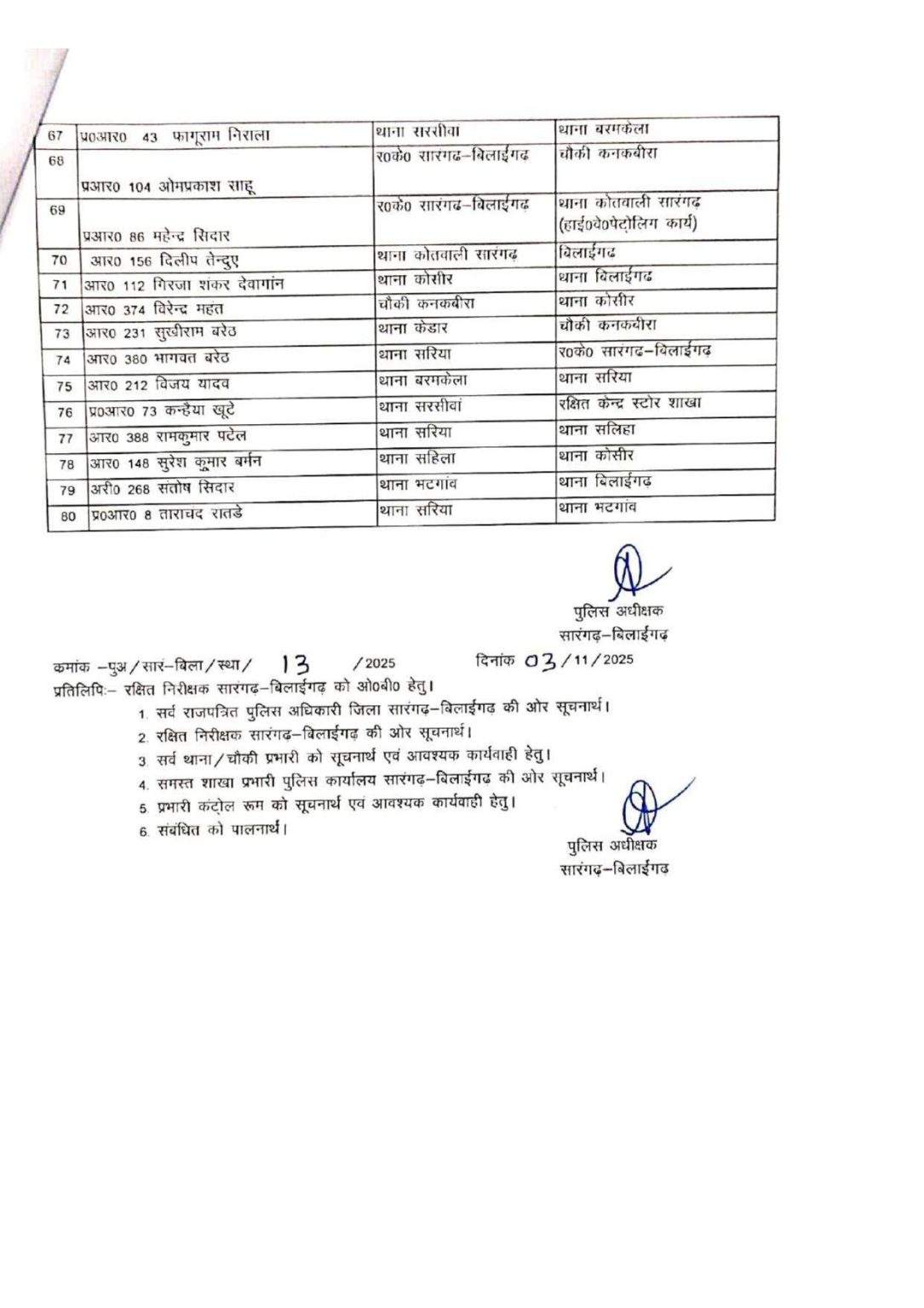 सारंगढ़–बिलाईगढ़। CG Police Transfer: पुलिस महकमे में एक बार फिर बड़े पैमाने पर तबादले किए गए हैं। जिसके तहत कुल 80 पुलिस कर्मियों को इधर से उधर किया गया है। इनमें प्रधान आरक्षक और आरक्षक स्तर के अधिकारी शामिल हैं।