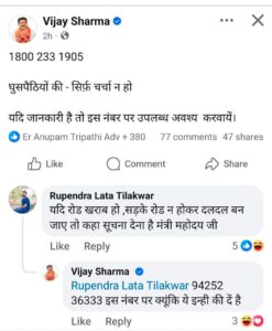 प्रदेश में राजनीति धरातल पर कम और ऑनलाइन प्लेटफॉर्म पर अधिक दिखाई दे रही है। पक्ष और विपक्ष के नेता एक दूसरे पर आरोप प्रत्यारोप लगाने के लिए ऑनलाइन प्लेटफॉर्म का भी इस्तेमाल बखूबी करते हुए नजर आ रहा है। वही एक बार फिर के प्रदेश के पूर्व मुख्यमंत्री भूपेश बघेल ओर उप मुख्यमंत्री विजय शर्मा आमने सामने नजर आ रहे हैं। बता दे प्रदेश में घुसपैठियों की शिकायत के लिए गृह मंत्री ने एक टोल फ्री नंबर फेसबुक पर पोस्ट किए, जिस पर एक यूजर ने रिप्लाई करते हुए लिखा कि यदि रोड खराब हो, सड़क रोड ना होकर दलदल बन जाए तो कहां सूचना देना है मंत्री महोदय जी, जिस पर गृहमंत्री ने रिप्लाई करते हुए एक नंबर जारी किया साथ ही लिखा कि इस नंबर पर क्योंकि यह इन्हीं की देन है