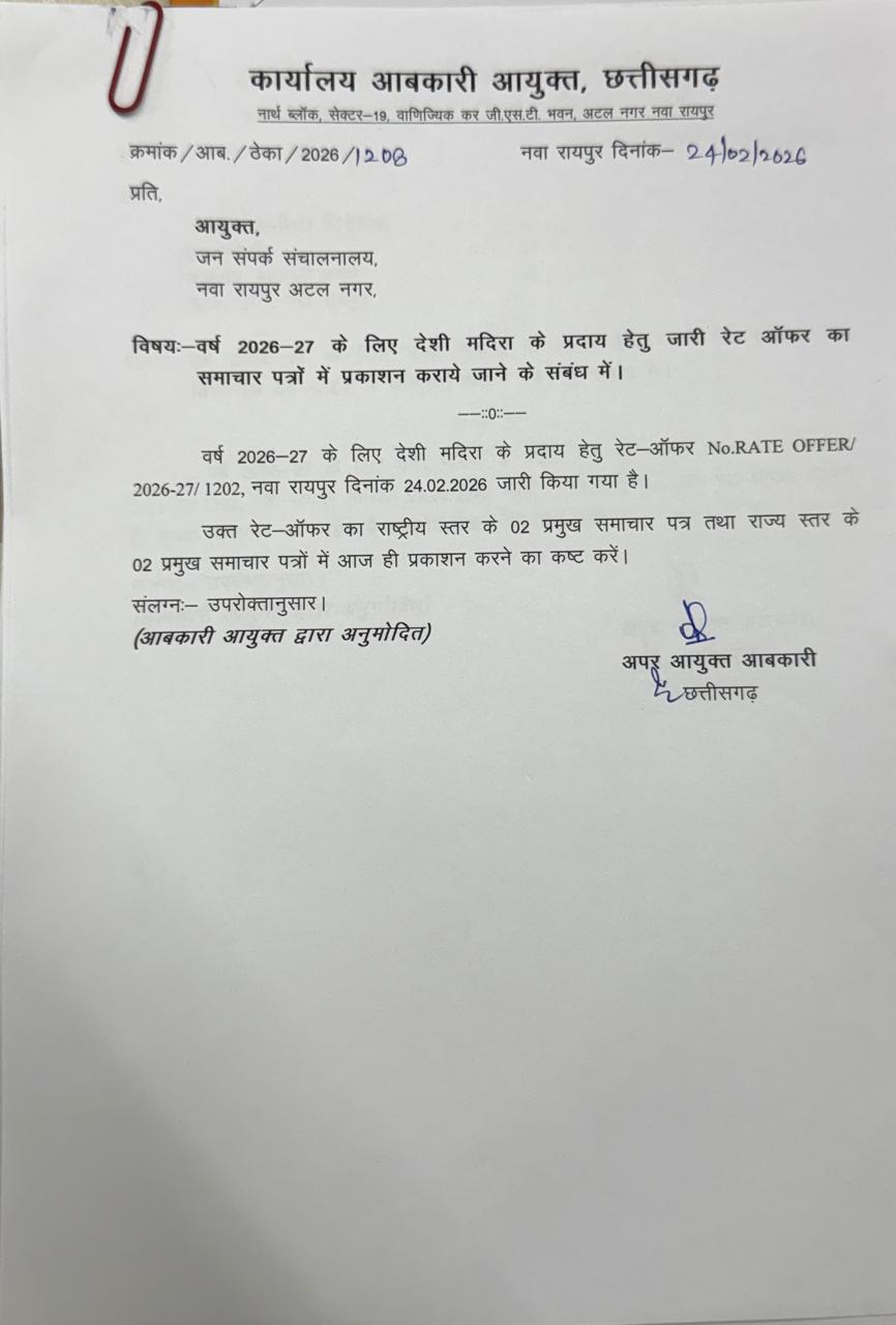 रायपुर। Raipur News: राजधानी रायपुर से इस वक्त एक बड़ी खबर सामने आ रही है। जहां देशी और विदेशी शराब कंपनियों से वर्ष 2026-27 के लिए रेट ऑफर मांगे गए हैं। इस संबंध में आबकारी विभाग ने आदेश जारी किया है।