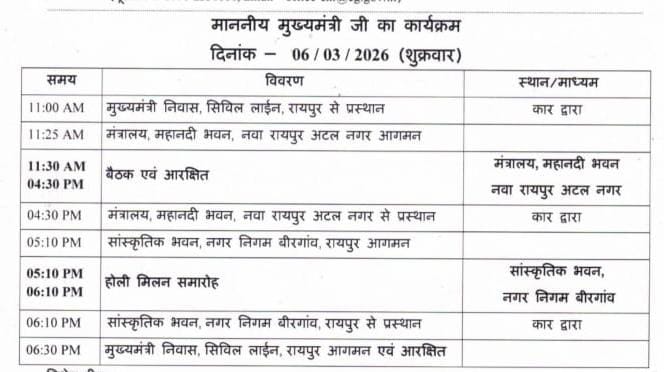 CM Sai Today Program: इसमें बाद सीएम साय शाम करीब 5:10 बजे बीरगांव के सांस्कृतिक भवन में “होली मिलन समारोह” में शिरकत करेंगे और शाम 6:30 बजे वे मुख्यमंत्री निवास पहुंचेंगे।