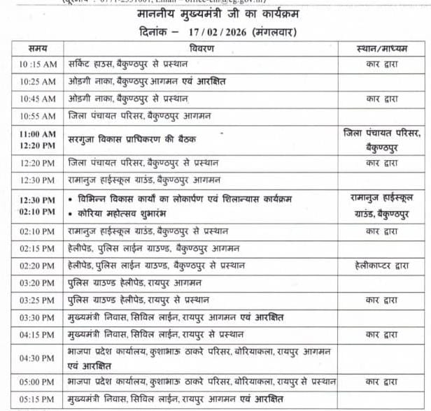 स्कूल ग्राउंड में विभिन्न विकास कार्यों का लोकार्पण और शिलान्यास करेंगे और दोपहर 2 बजे कोरिया महोत्सव का शुभारम्भ करने के बाद दोपहर 02 : 15 में राजधानी रायपुर के लिए वापसी करेंगे।
