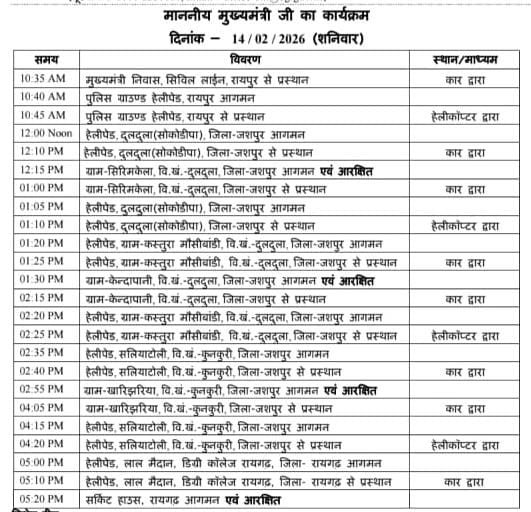 CM Sai Today Program: वहीं मुख्यमंत्री विष्णु देव साय 12 बजे से लेकर शाम 4:30 बजे तक जशपुर जिले के कई ग्रामों का दौरा सीएम साय करेंगे  और इसके बाद शाम 5:00 रायगढ़ पहुंचेंगे, जहां वे रात्रि विश्राम भी करेंगे।