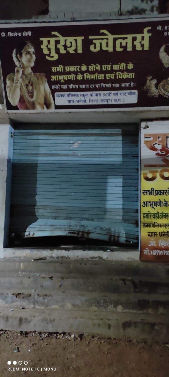 रायपुर- रायपुर के धरसीवां के धनेली बाजार चौक में बड़ी चोरी का मामला सामने आया है. जहाँ सुरेश ज्वेलर्स का शटर तोड़कर शातिर चोर दुकान में रखे डेढ़ किलो चांदी और 10 ग्राम सोने के जेवर समेत दुकान का कैमरा तोड़कर डीवीआर भी ले उड़े.