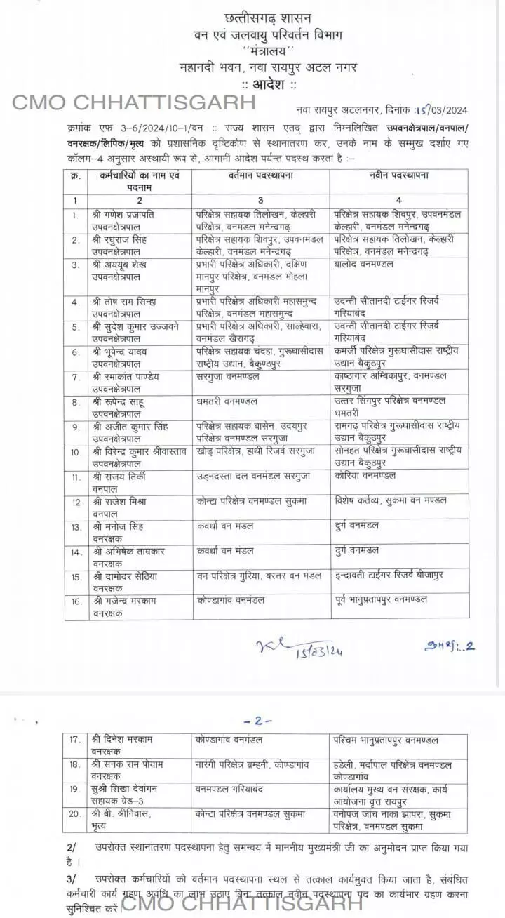 रायपुर। राज्य सरकार ने वन विभाग में पदस्थ अधिकारियों-कर्मचारियों की ट्रांसफर लिस्ट जारी की है। लिस्ट में जिनके नाम हैं, वो इस प्रकार है, नीचे देखें लिस्ट…
