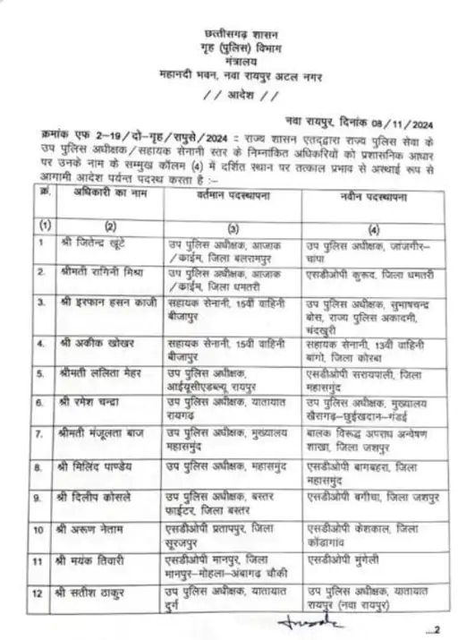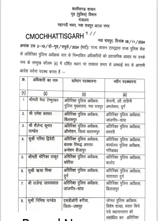 छत्तीसगढ़ में ASP और DSP रैंक के 36 पुलिस अफसरों का ट्रांसफर, देखे लिस्ट …