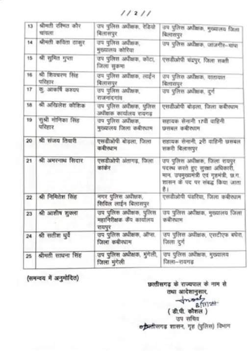 इसके अलावा पुलिसिंग में कसावट लाने डीएसपी स्तर के अधिकारियों का भी तबादला किया गया है। आशीष शुक्ला कबीरधार DSP बनाए गए हैं। सतीश ठाकुर को फिर से रायपुर यातायात DSP की जिम्मेदारी सौंपी गई है। छत्तीसगढ़ शासन गृह (पुलिस विभाग) के उप सचिव डीपी कौशल ने आदेश जारी किया है।