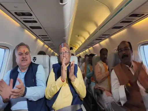 छत्तीसगढ़ के मुख्यमंत्री साय, उप मुख्यमंत्री साव समेत मंत्रिमंडल के सदस्य आसमान में 20,000 फीट की ऊंचाई पर प्लेन में भजन गाते नजर आए। इस दौरान CM साय तालियां बजाते और उपमुख्यमंत्री झूम झूमकर भजन गाना गा रहे थे। वहीं राजस्व मंत्री मोबाइल से लिरिक्स देख रहे थे और सभी राम भक्ति में रमे हुए नजर आए।